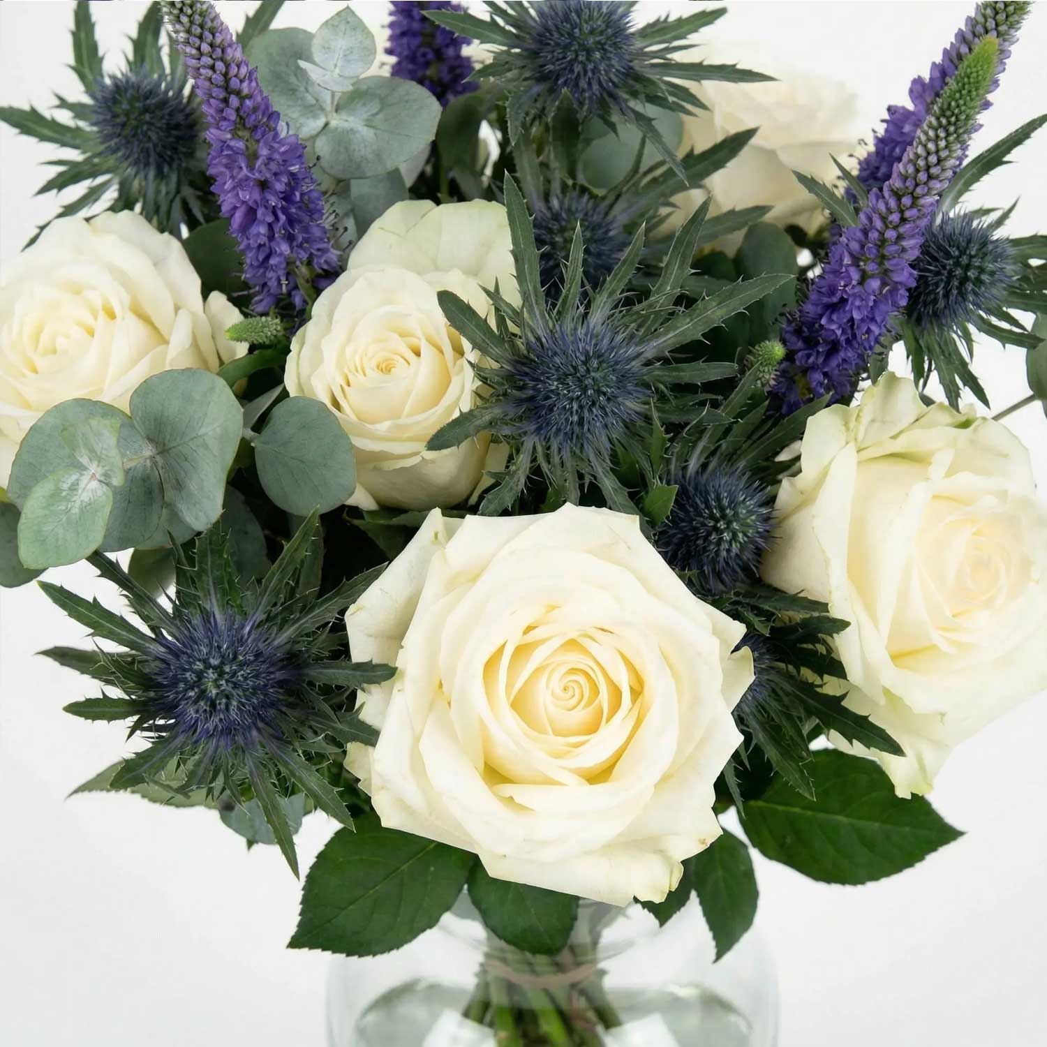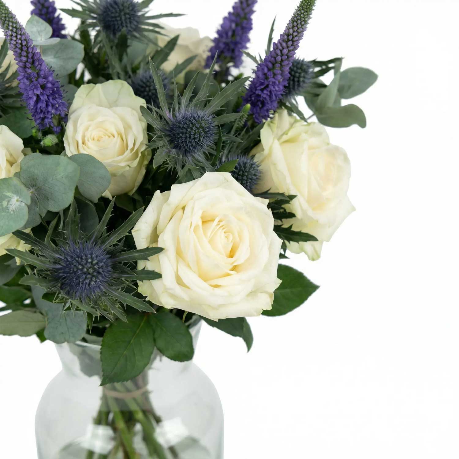 Deluxe: 7x White avalanche roses, 5x Veronica, 4x Eryngium and 5x Eucalyptus