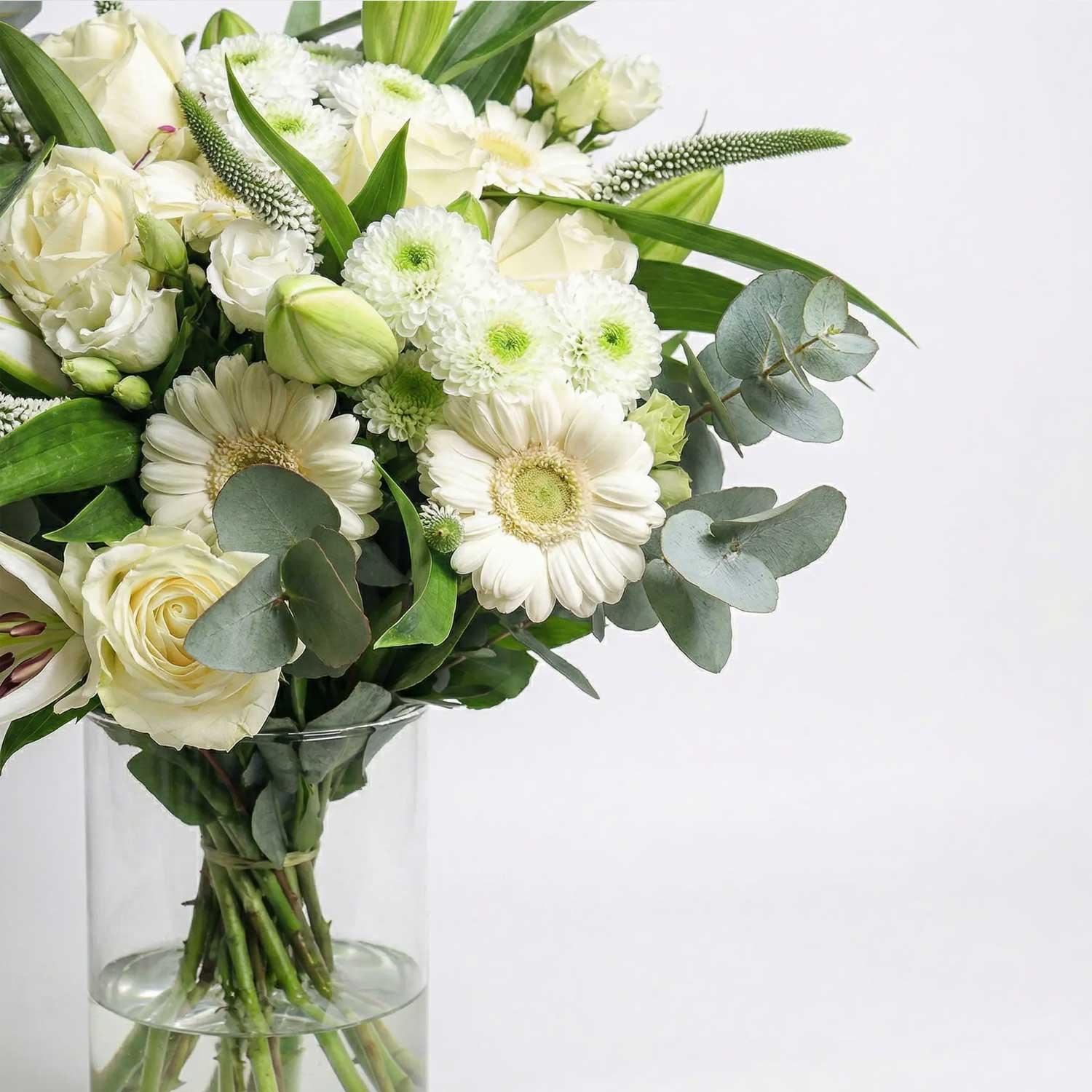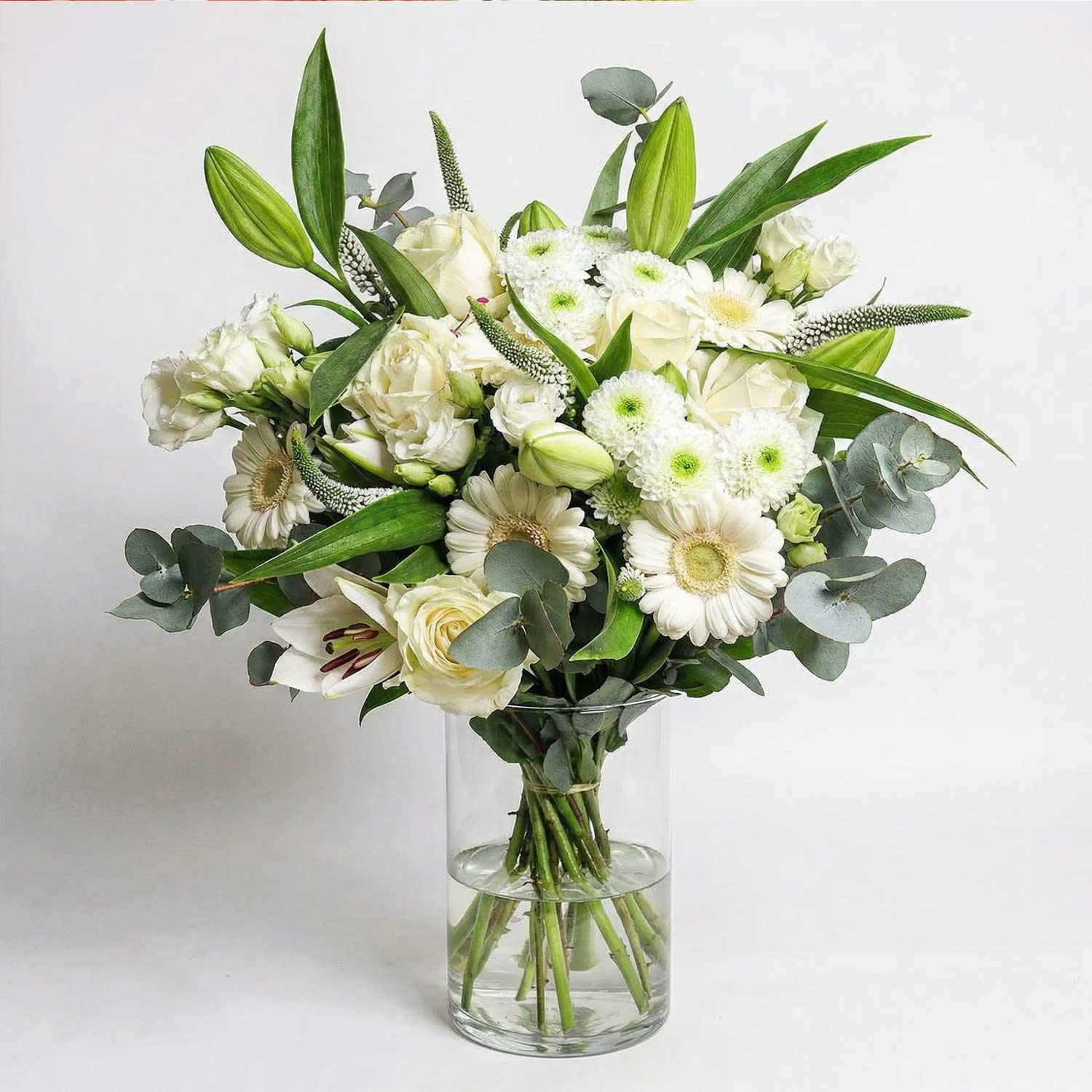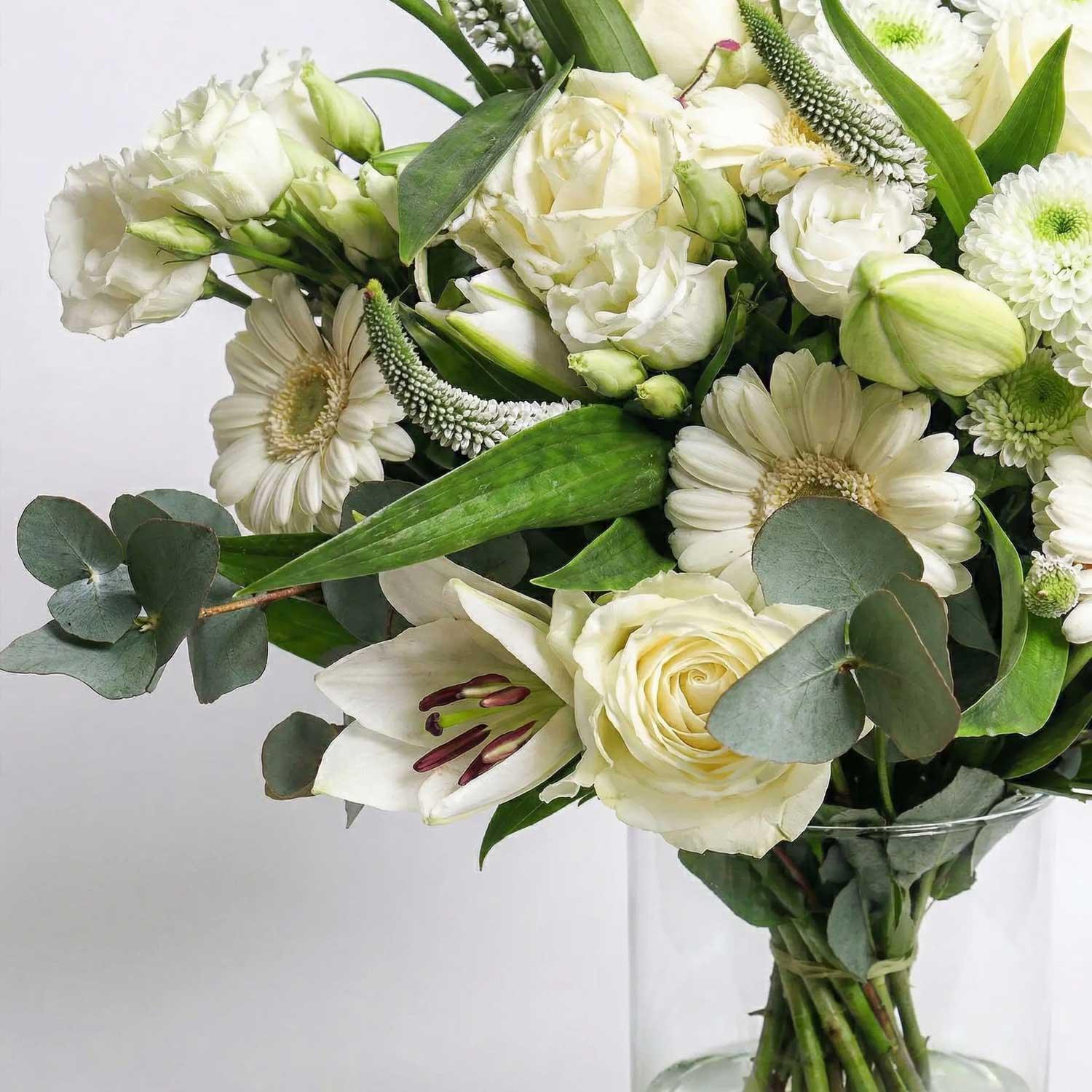 A stunning hand-tied bouquet featuring roses, lisianthus, gerberas, lilies and veronica combining elegance, charm, and vibrant colour. Roses add classic beauty, lisianthus brings delicate, ruffled petals, gerberas provide bold, cheerful blooms, and the veronica introduces texture. A beautifully balanced arrangement with soft textures and eye-catching contrast, perfect for any occasion!