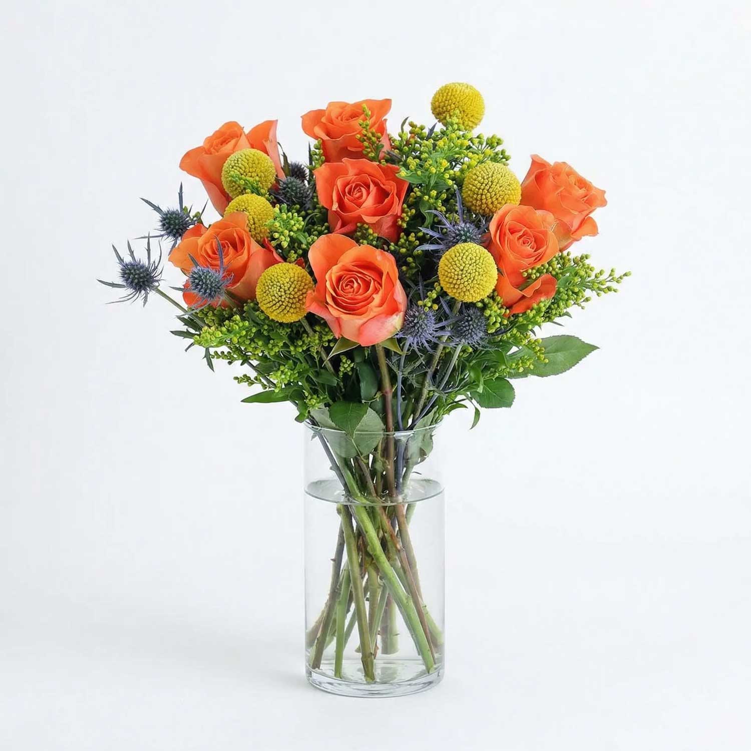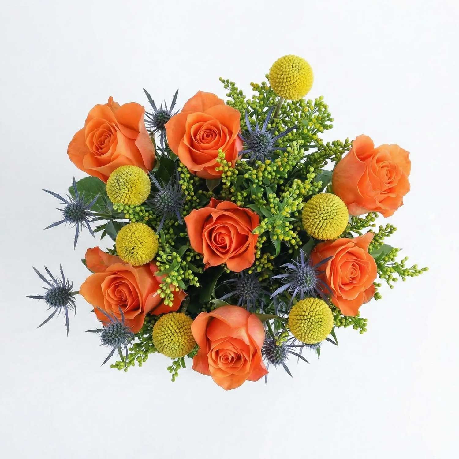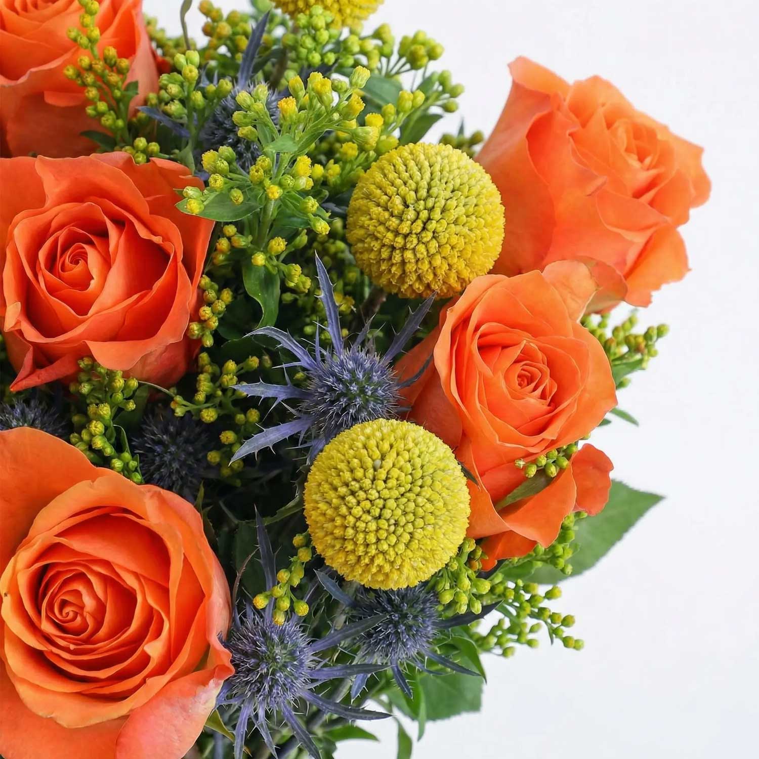 A vibrant hand-tied arrangement of 21 stems featuring orange roses, solidago, craspedia, and eryngium. The warm orange roses exude energy, solidago adds golden fullness, craspedia brings playful texture, and eryngium offers striking blue accents for a unique and cheerful display.