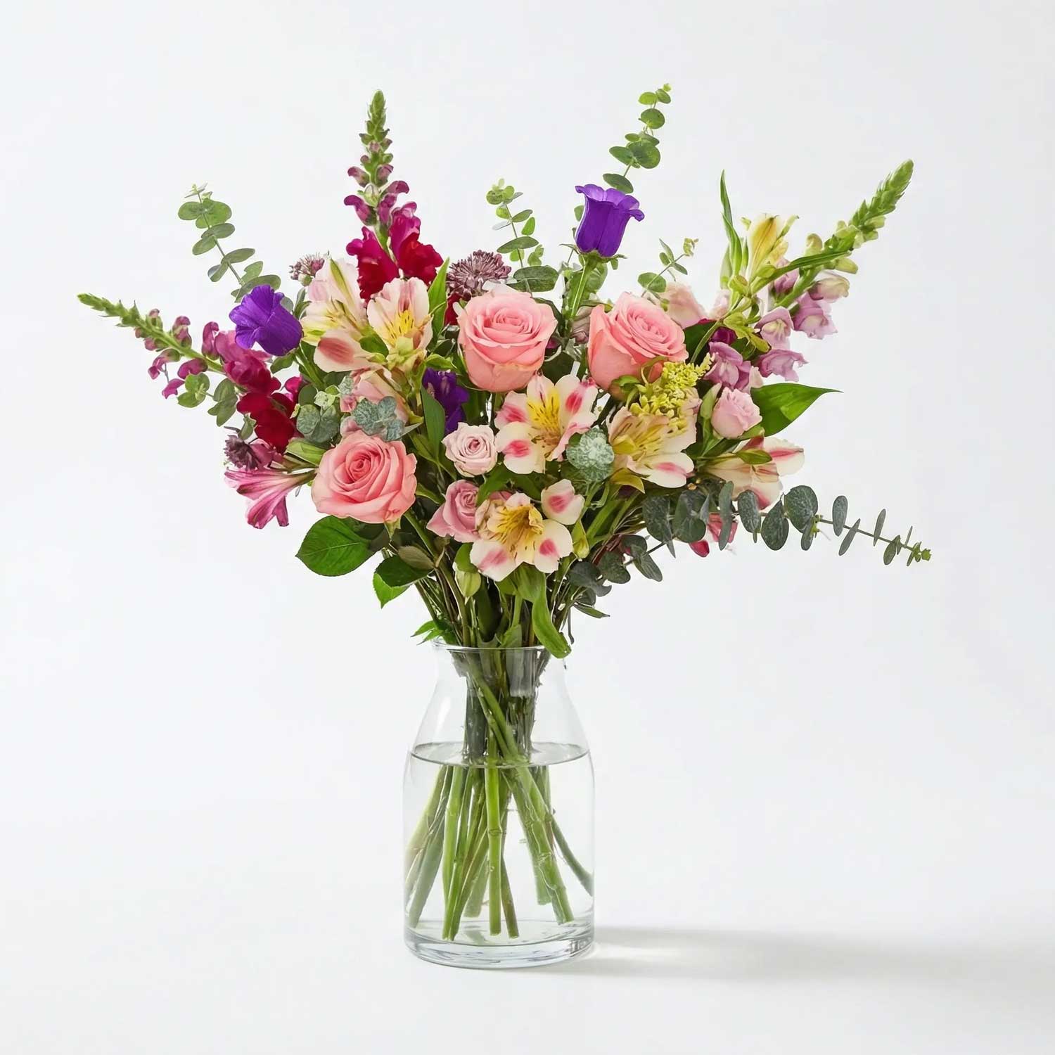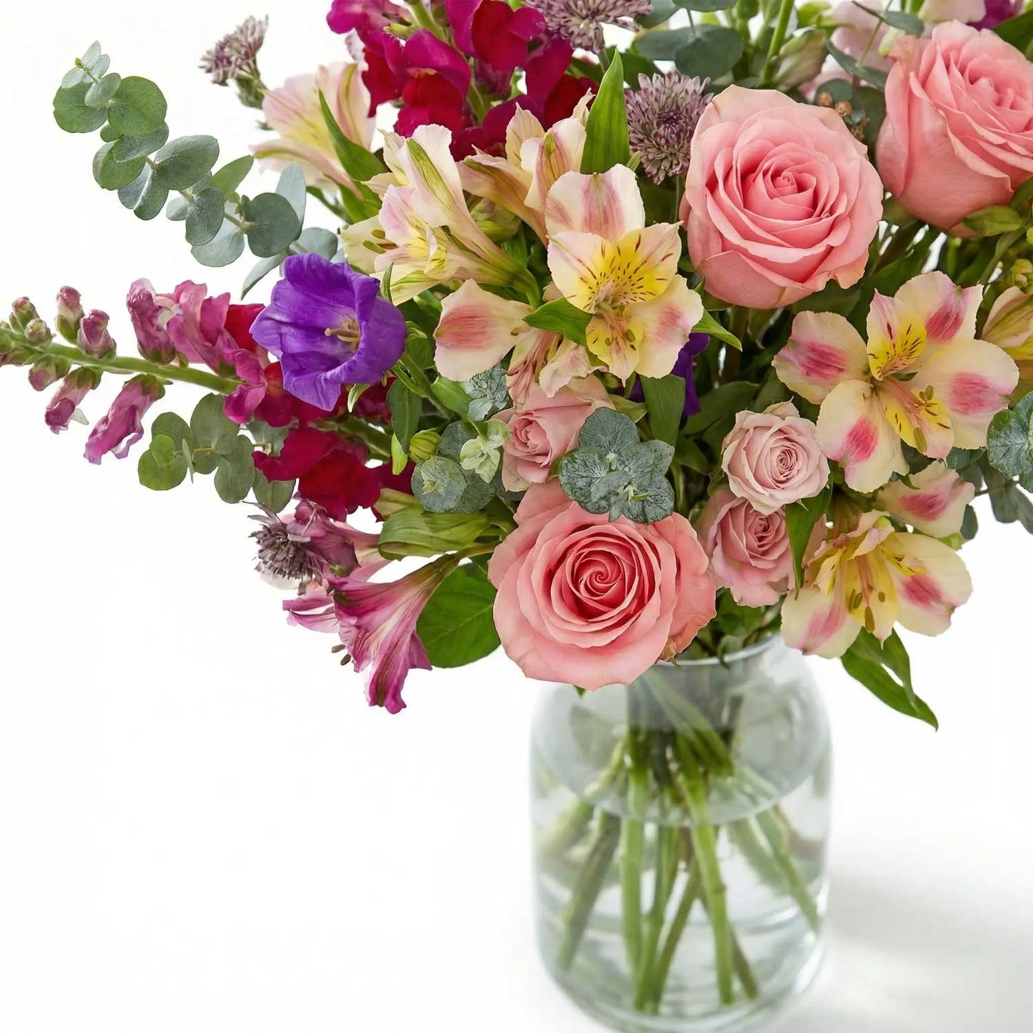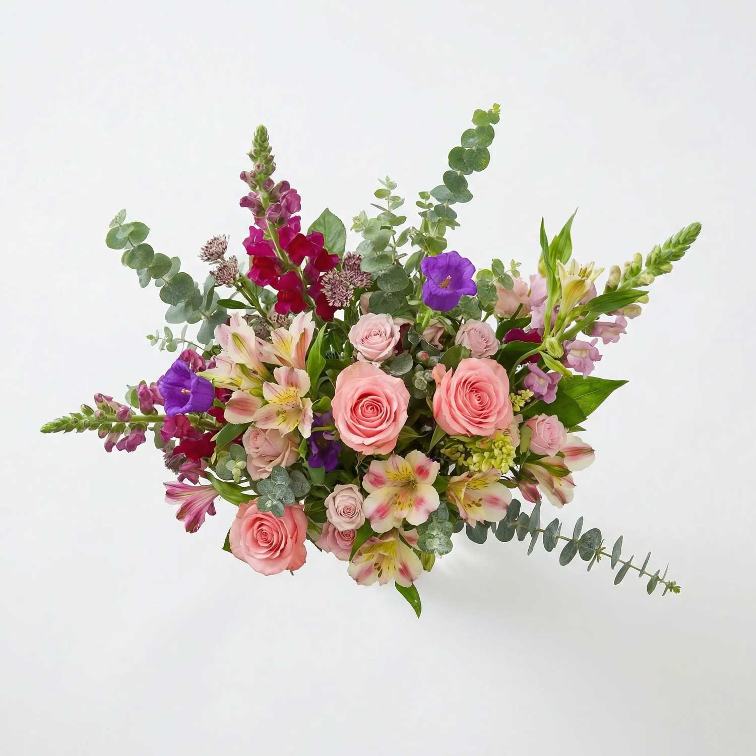 21 stems of British Alstroemeria, Pale Pink Roses, Spray Roses, Aubergine Snapdragons, Lilac Snapdragons, Purple Campanula, Astrantia and Eucalyptus.