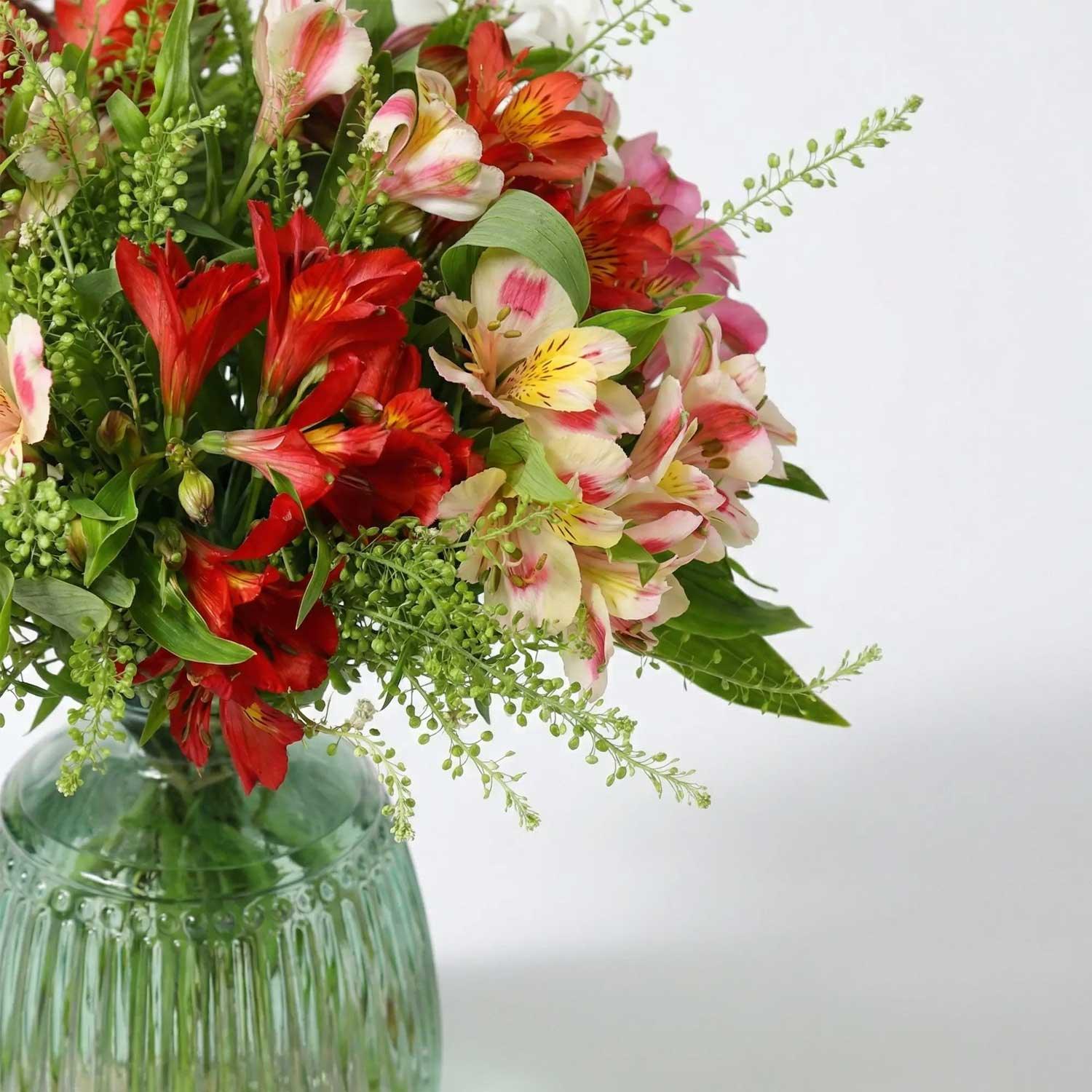 A letterbox flower bouquet featuring a mix of colours of British-grown Alstroemeria and thlaspi, designed to fit through your letterbox. The vibrant Alstroemeria, are known for adding a burst of colour and texture to the bouquet.