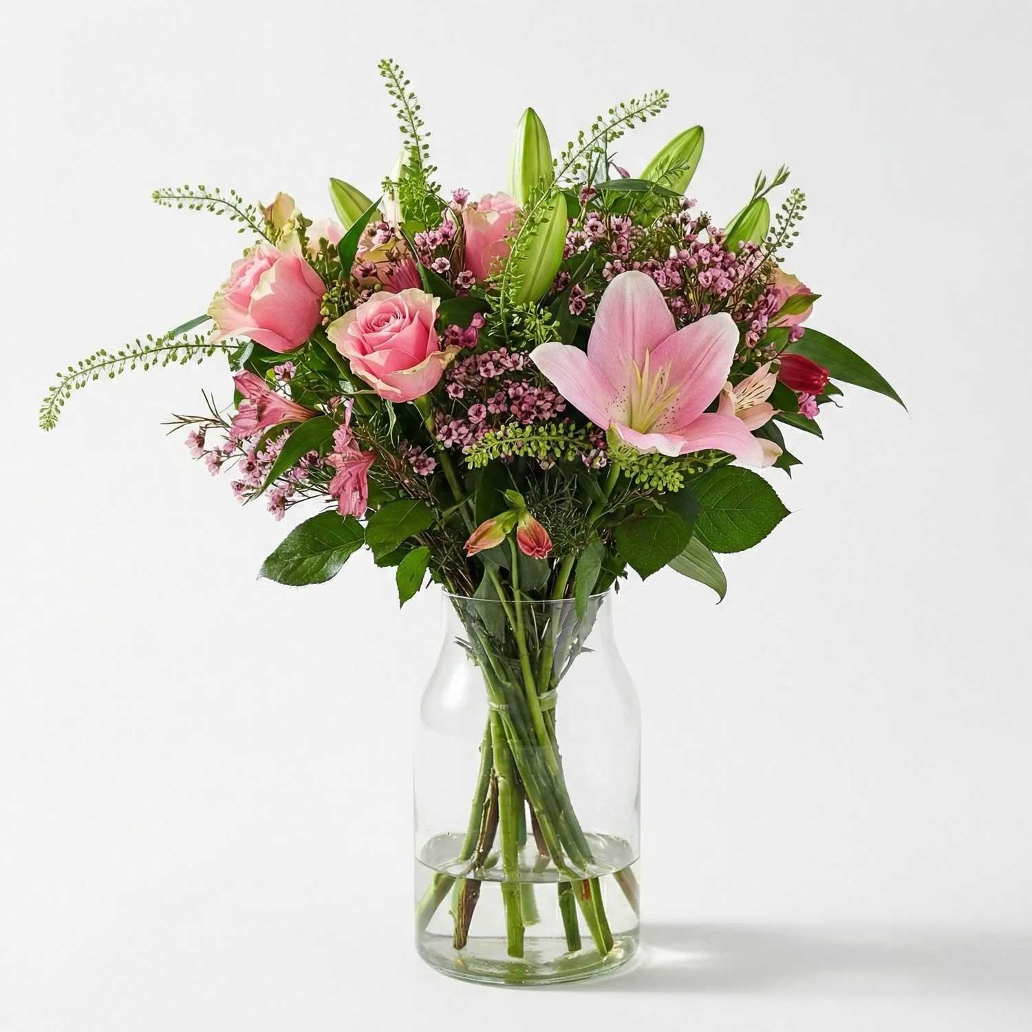 A luxury hand-tied bouquet of pink oriental lilies, pink roses, alstroemeria, waxflower, and thlaspi. The lush pink lilies and roses create a soft, vibrant centrepiece, while the delicate alstroemeria and waxflower adds texture and charm. Thlaspi’s airy greenery completes the arrangement, offering a fresh and balanced finish.