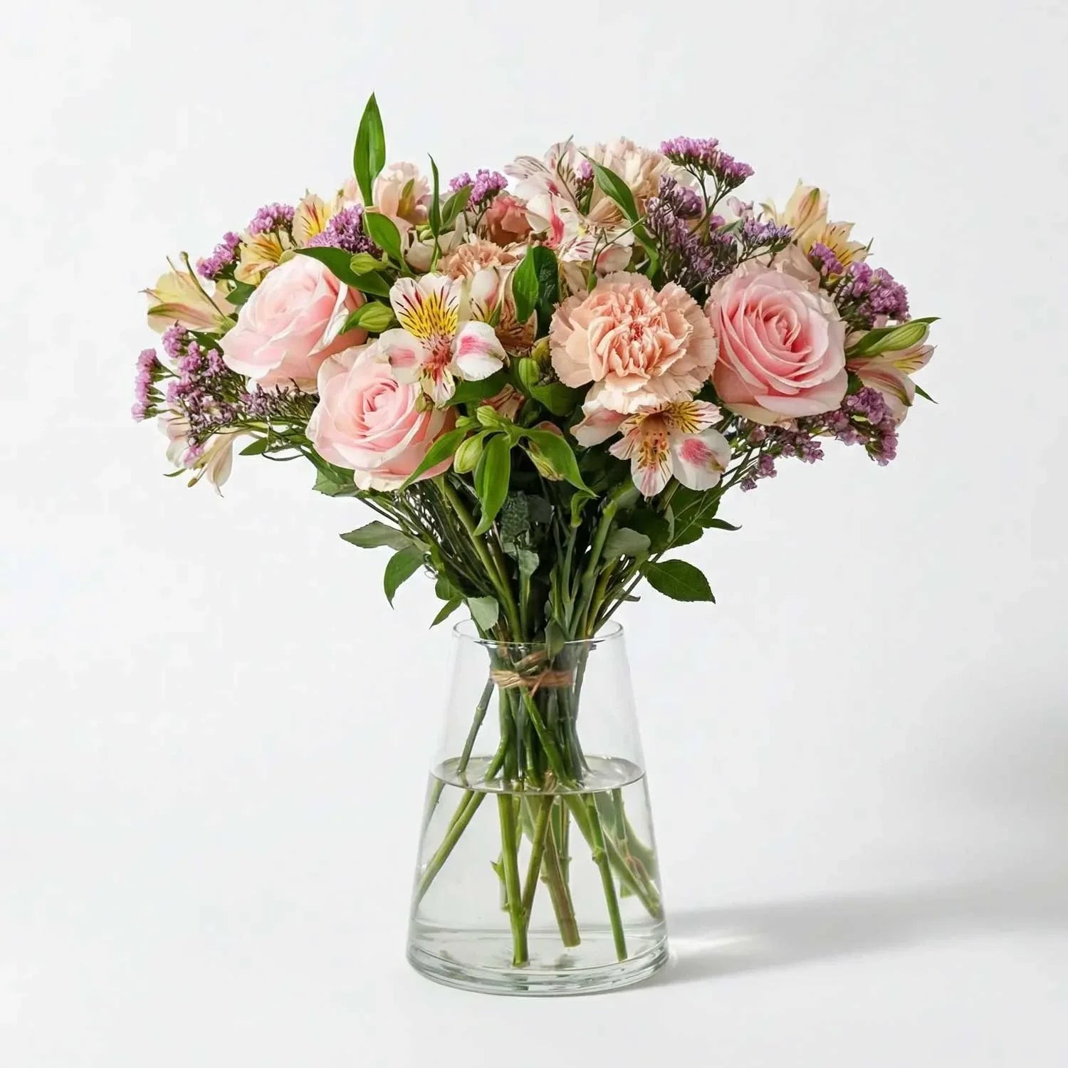 Delicately arranged, this elegant hand-tied bouquet features soft pale pink roses, paired with vibrant British alstroemeria, carnations, and sprigs of sea lavender for a touch of texture. Accented with fresh eucalyptus, this stunning combination brings together timeless beauty and a natural, airy feel, perfect for any occasion.